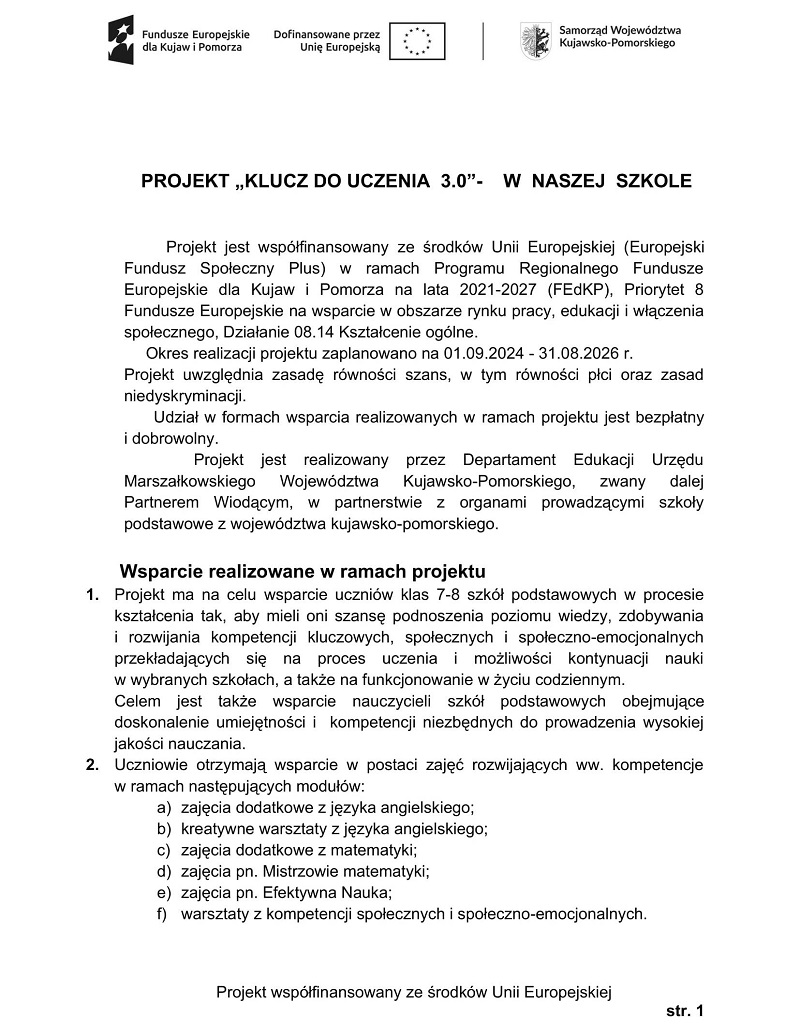 Projekt jest współfinansowany ze środków Unii Europejskiej (Europejski Fundusz Społeczny Plus) w ramach Programu Regionalnego Fundusze Europejskie dla Kujaw i Pomorza ...